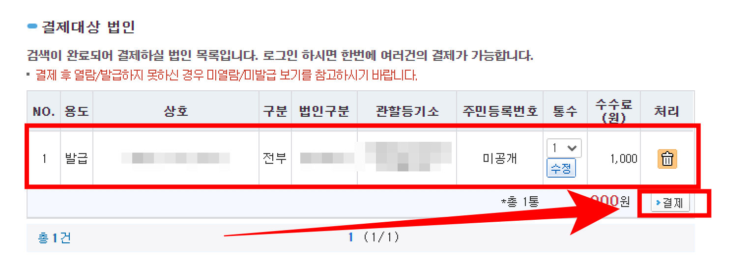 12. 그 후 결제대상 법인을 선택해서 '결제'를 눌러주시면 됩니다.