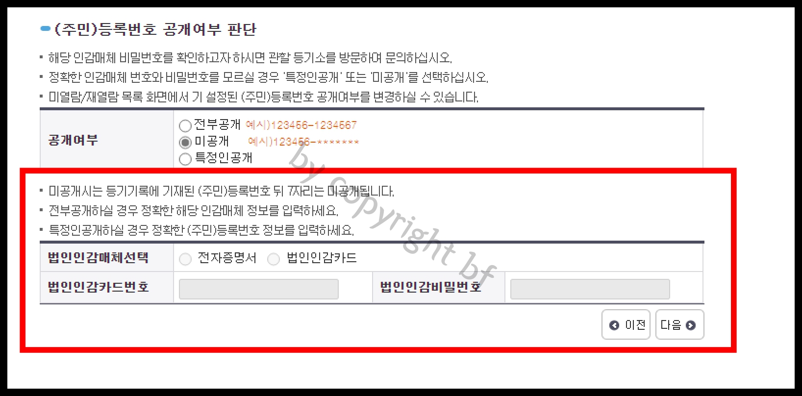 10. 이제 등록번호 공개 여부를 선택해주시면 됩니다.