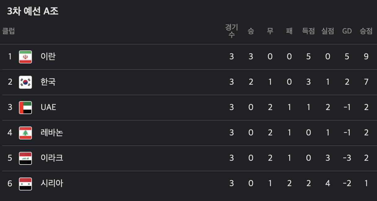 현재 한국은 이란에 이어 조 2위인데요. 이번 이란전에서 이란을 꺾으면 조 1위로 치고 나갈 수 있기 때문에 이란전은 정말 중요한 경기입니다.