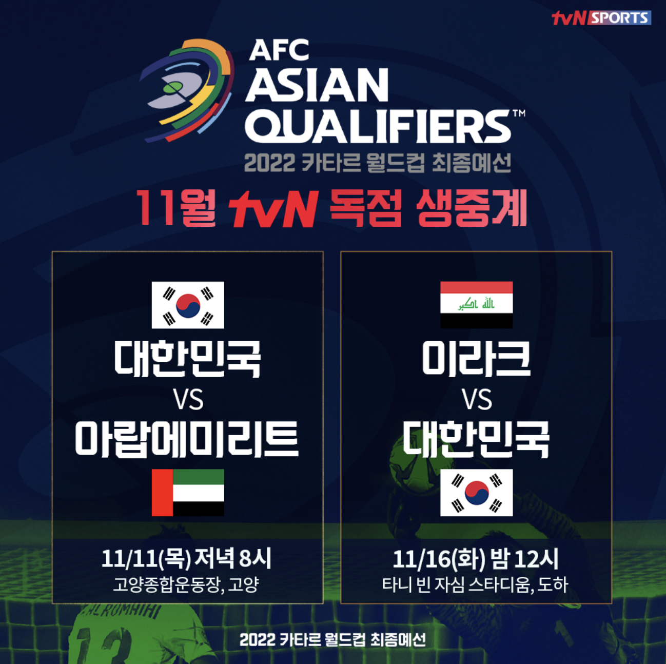 이번 10월 12일에 있을 이란과의 경기는 TVN에서 독점 생중계를 합니다.