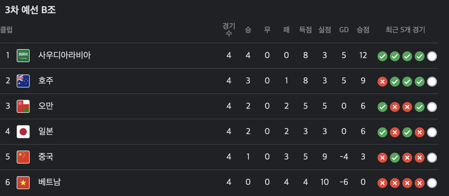 일본은 호주에게 질거라 예상했지만 승리를 거두고 오만에 이은 조 4위입니다.