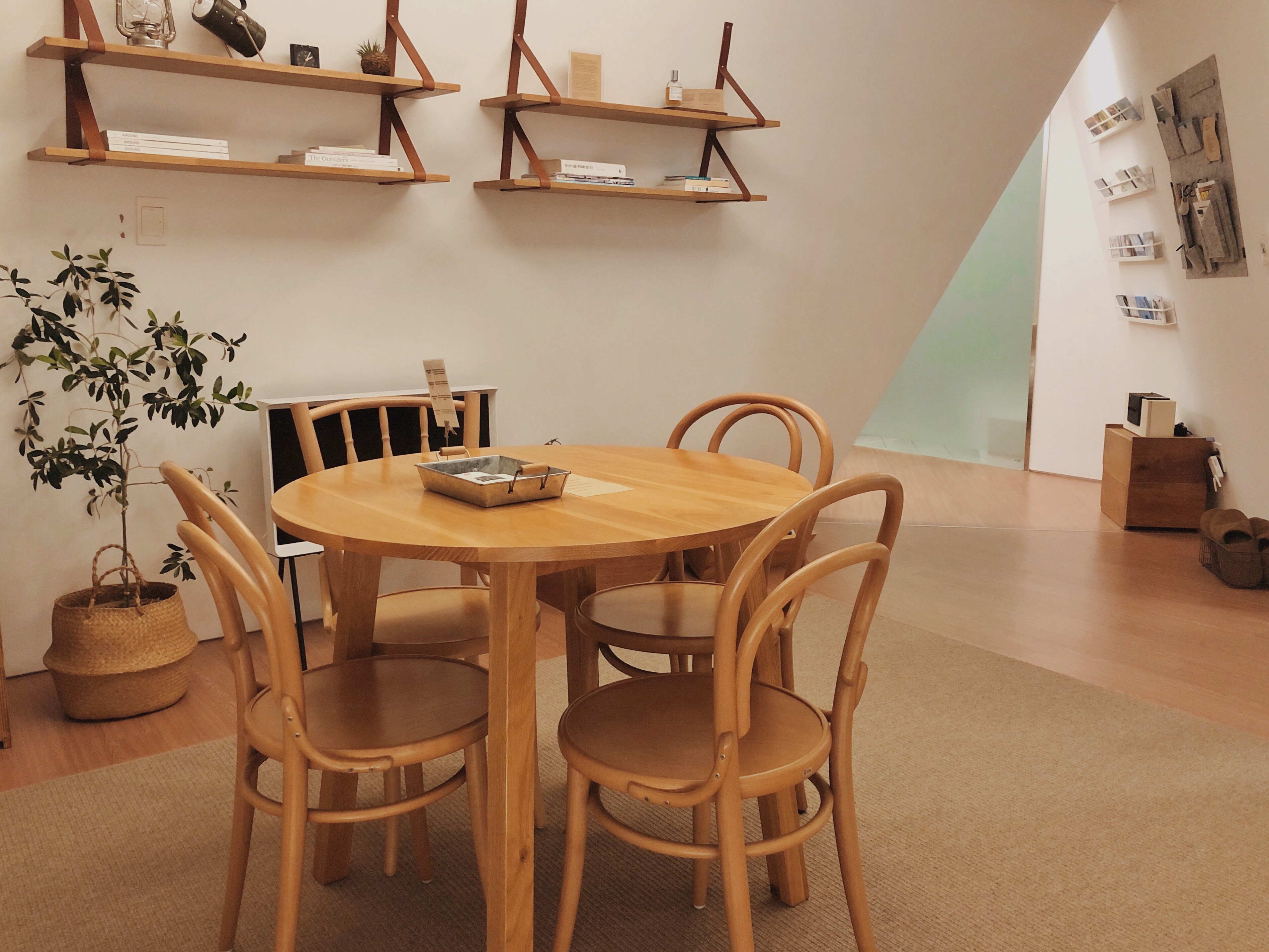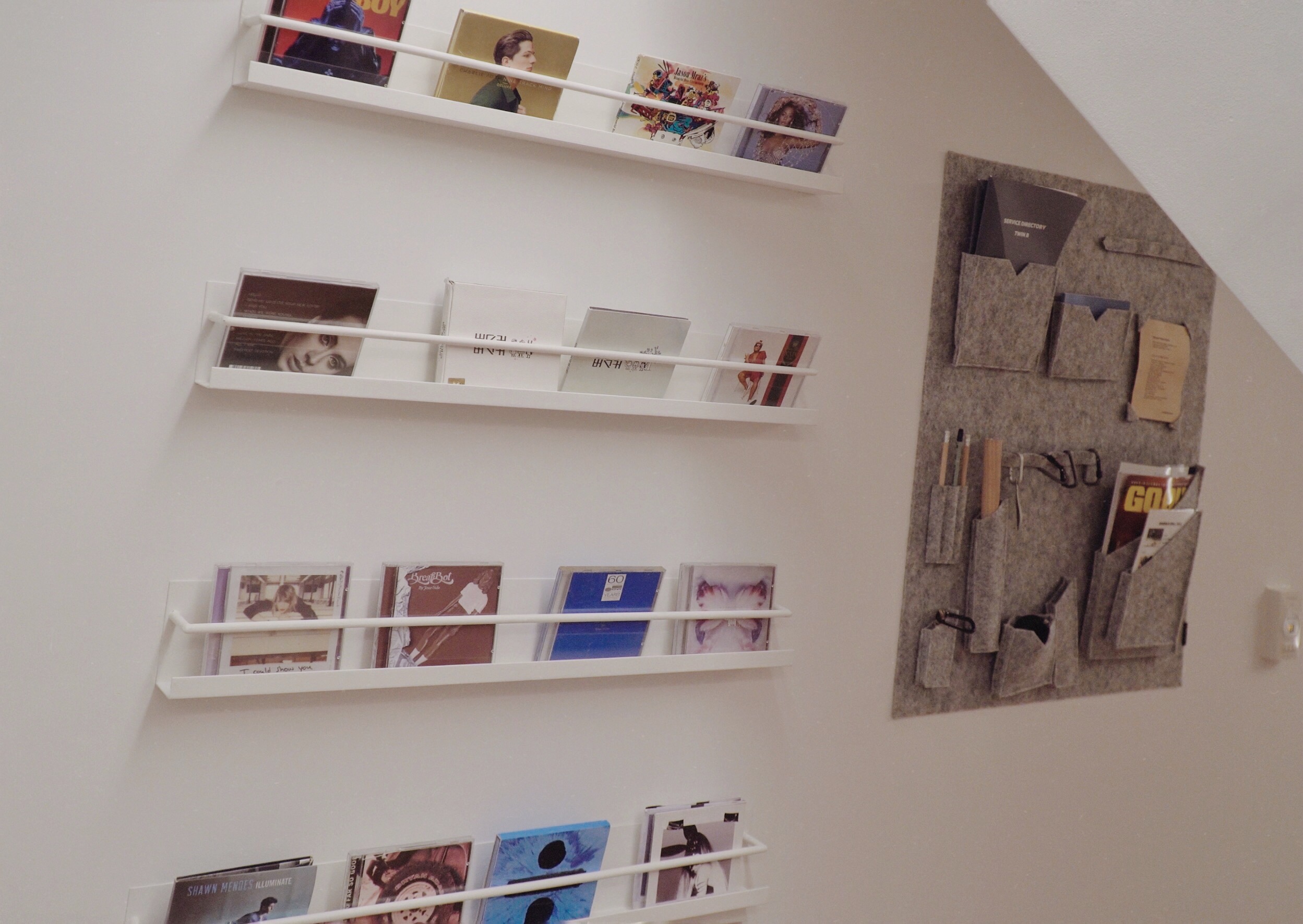 문을 열고 들어간 내부는 적당한 조도와 기분 좋은 음악이 흘러나오고 있었다. 직접 원하는 음악을 들을 수 있게 CD 몇 장이 구비되어 있었다. 아델, 에드 시런, 버스커버스커 음악을 들었던 것 같다. 이 벽면은 출입문을 열고 우측에 붙은 벽면이다. 건물이 위로 좁은 사다리꼴 형태라 입체적인 공간이 연출됐다. 벽이 약간 기운 듯 보였다면 제대로 보신 거다. 앞으로 기울어 있다.