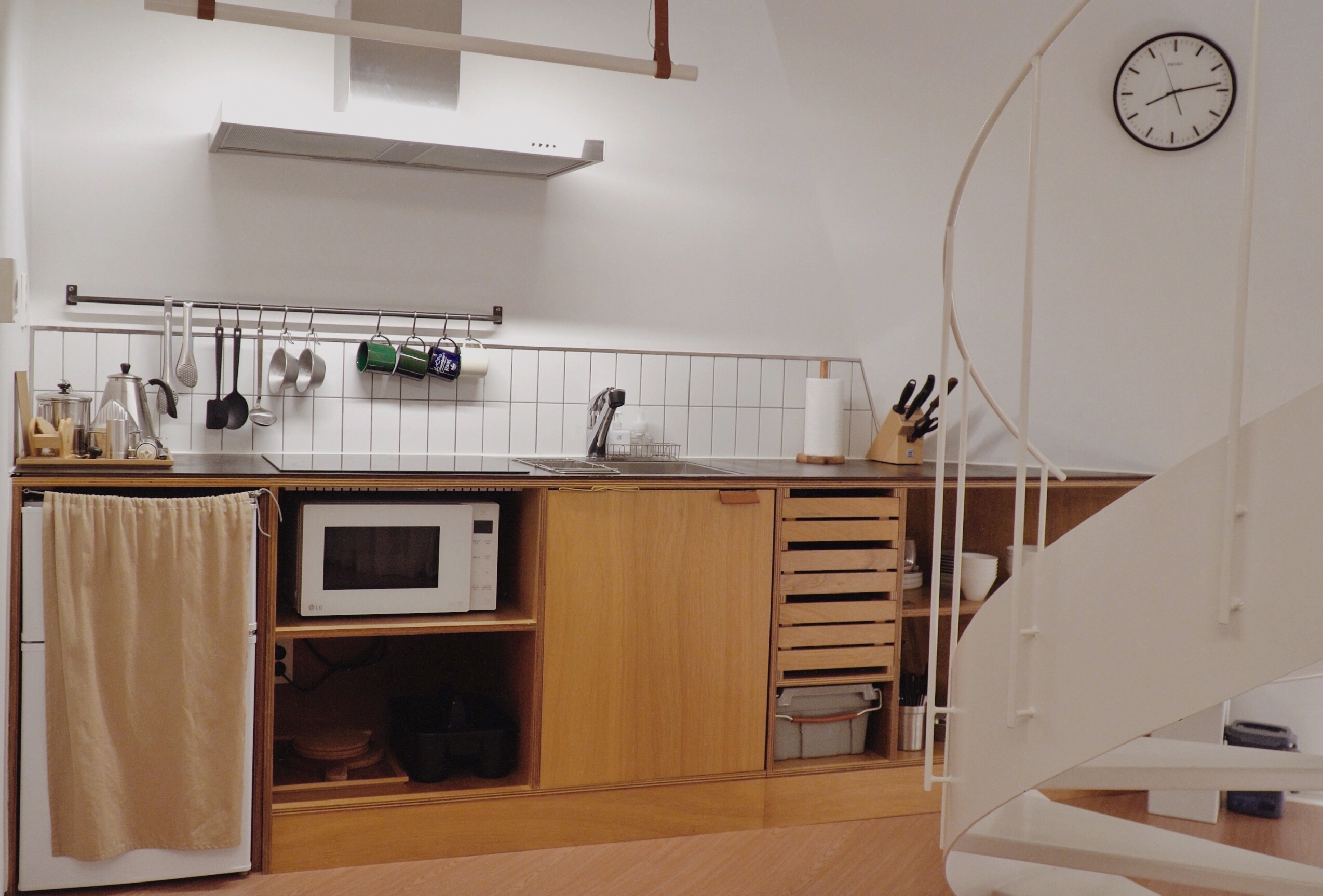 1층 공동 공간에 있는 주방이다. 캠핑장답게 간단하게 바비큐를 해 먹을 수 있는 장비들이 있었다. 집게나 고기 자르는 가위 접시 등등.. 주방 타일, 하다못해 저 타일 쫄대에 줄눈 색상까지 허투루한 게 하나도 없었다. 여기 구비되어 있는 커피는 커피머신이 아니라 드립커피였다. 캠핑이라는 주제에 맞는 어레인지였다.