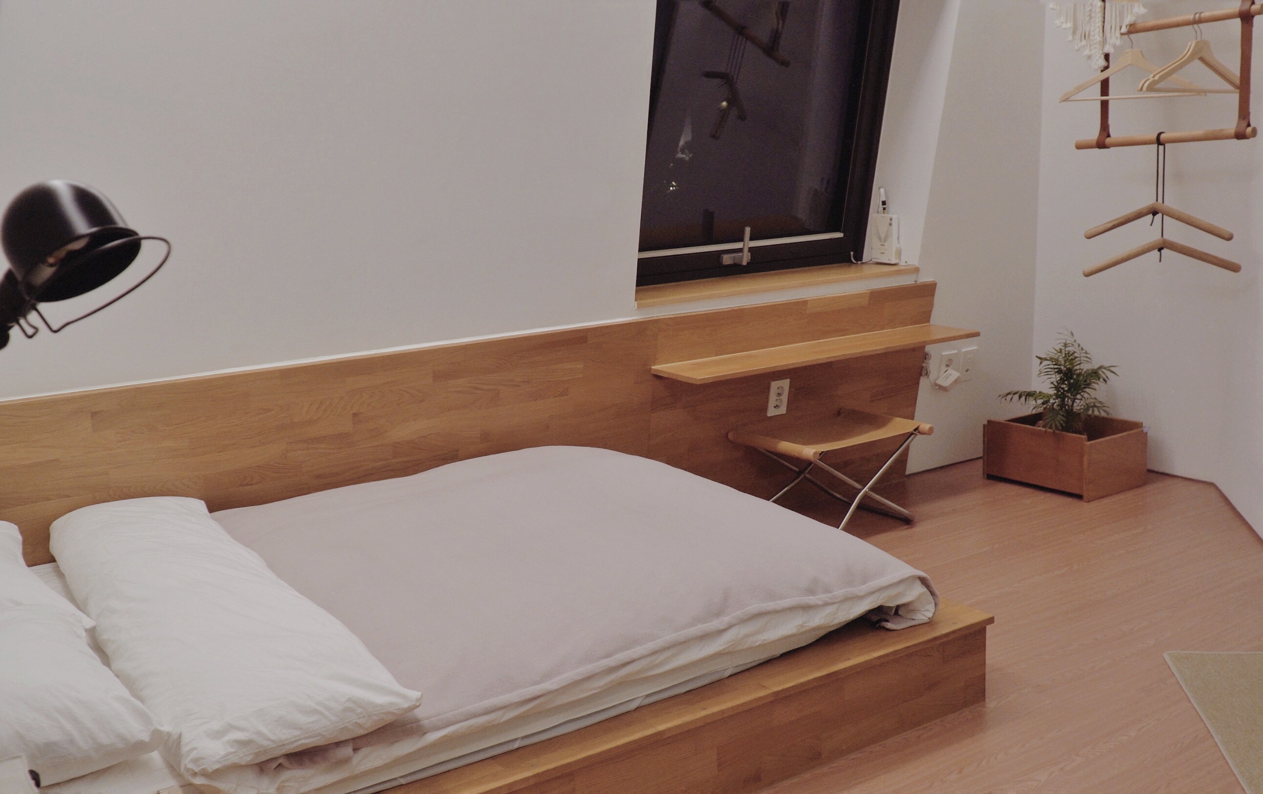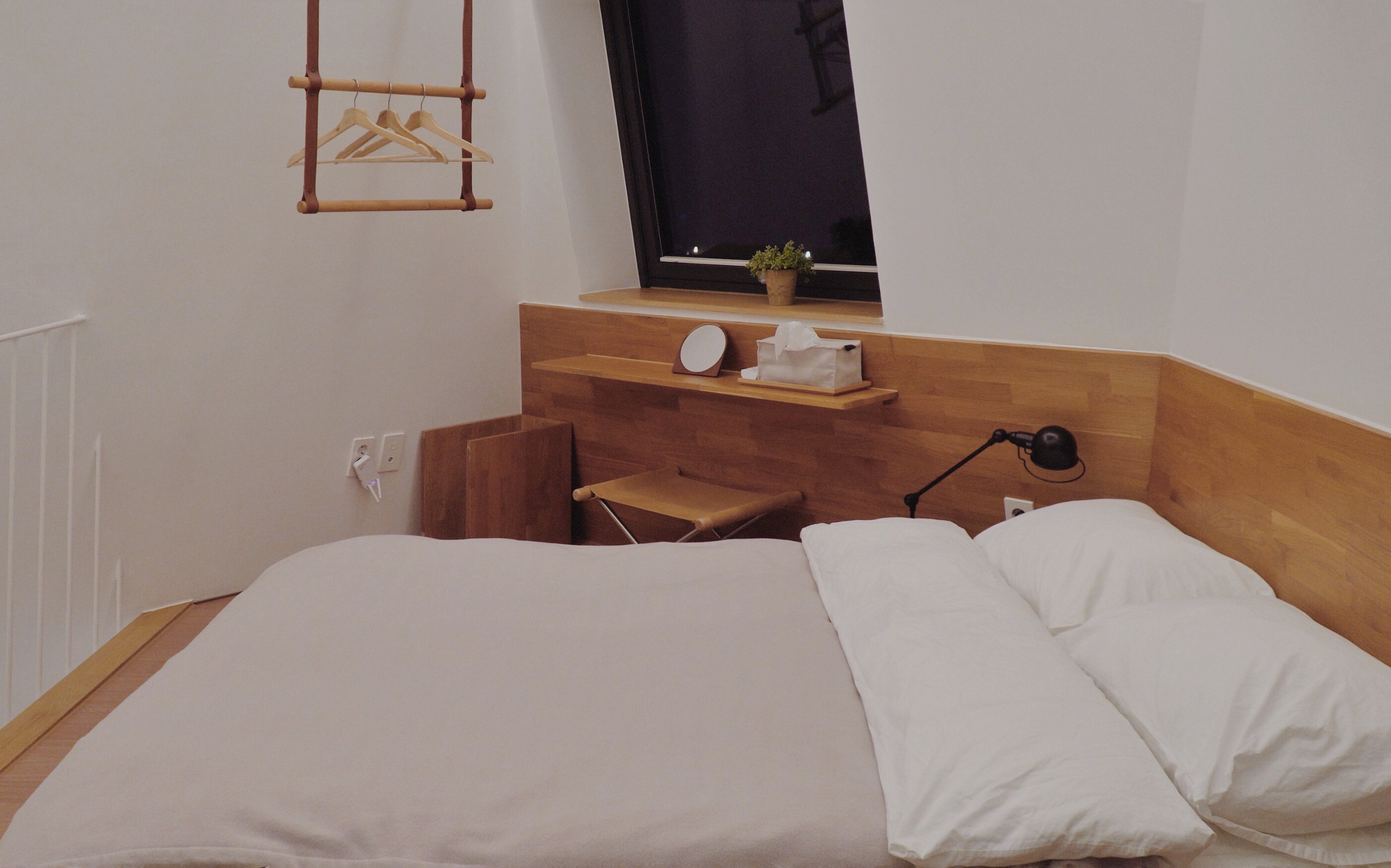 CD 걸린 벽면 맞은편에는 침실이 있다. 내방도 아예 원목으로(정확히 말하면 각재로 틀을 짜고 편백나무 루바를 두른) 침대가 있는데, 가벽을 짙게 페인팅해서 원목 느낌이 많이 나지 않는다. 여긴 원목 느낌을 살려 더 아늑한 분위기가 났다. 가죽 끈과 봉으로 천장에 고정해서 만든 행거도 매우 마음에 들었다. 정말 신경 많이 쓴 게 여기저기서 티가 났다. 특이하게도 방문은 없지만, 침대가 안쪽으로 쏙 들어와 있어서 거실에서 목을 쭉 빼지 않는 한 보이지 않는 구조였다.