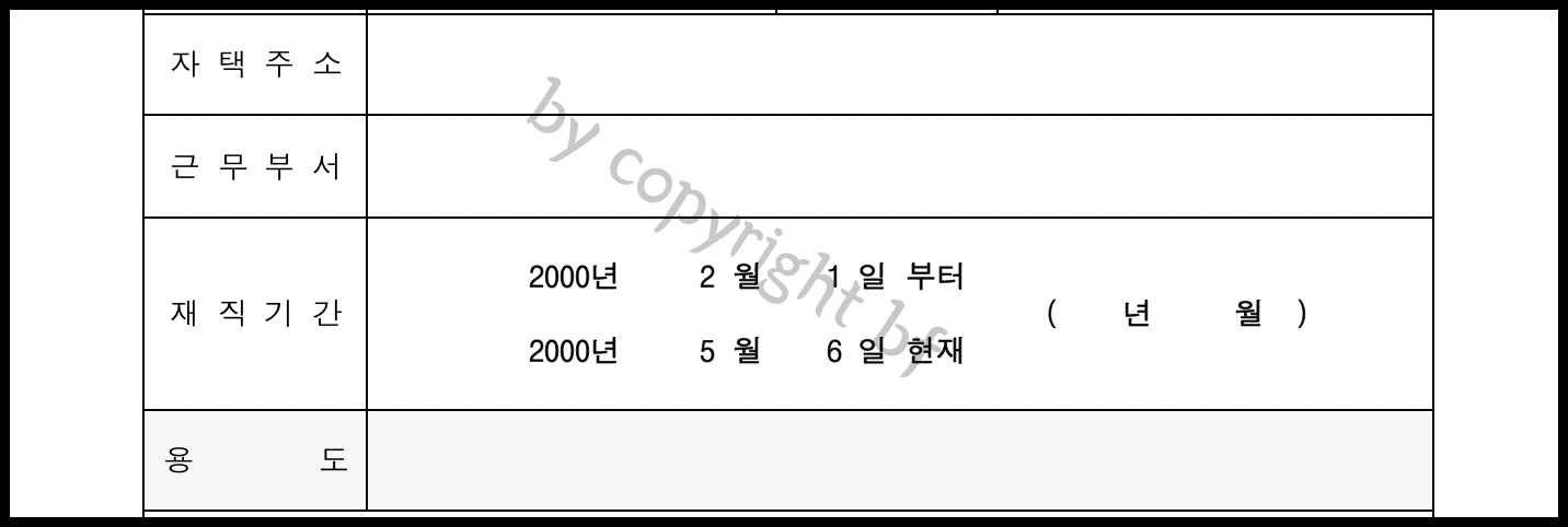 또한 재직증명서 중간에는 자택주소와, 근무부서, 재직기간, 제출 용도를 맞게 작성하시면 됩니다.