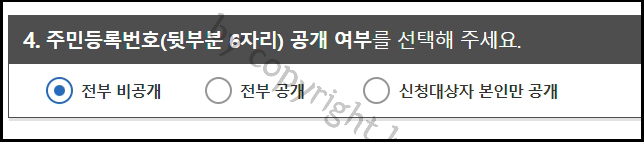 9. 일반 증명서로 해주시고요. 주민번호는 필요에 따라 공개 혹은 비공개를 선택하시면 됩니다. 마지막으로 신청사유입니다. 연말정산이나, 기타 금융기관 제출 등 목적에 맞는 용도를 선택해주시면 됩니다.