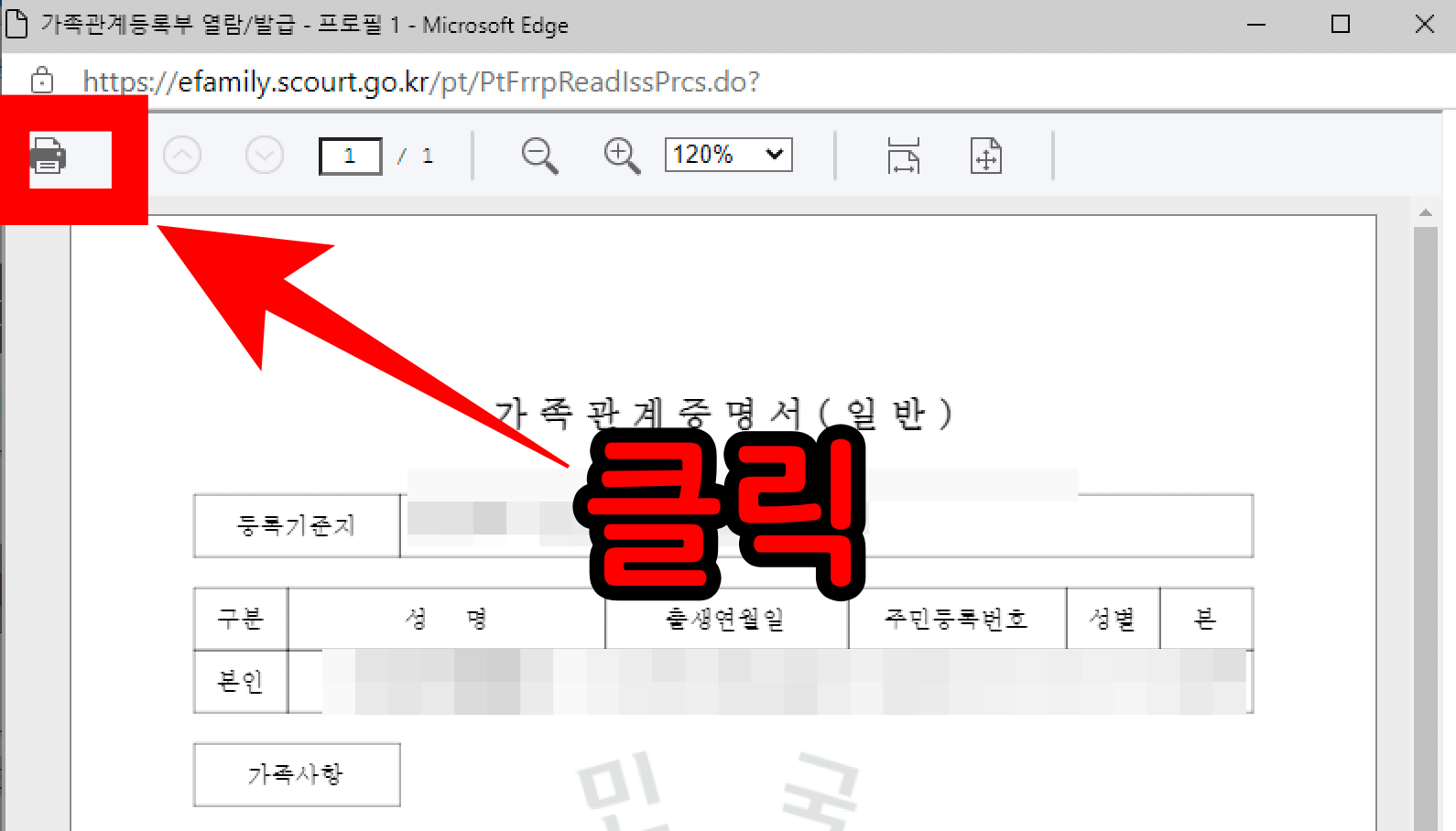 그럼 신청하신 가족관계증명서가 뜰것입니다. 맞는지 확인을 해주세요. 확인해주셨다면 상단의 프린터기 마크를 눌러주시면 오른쪽과 같이 인쇄를 선택할 수 있습니다.