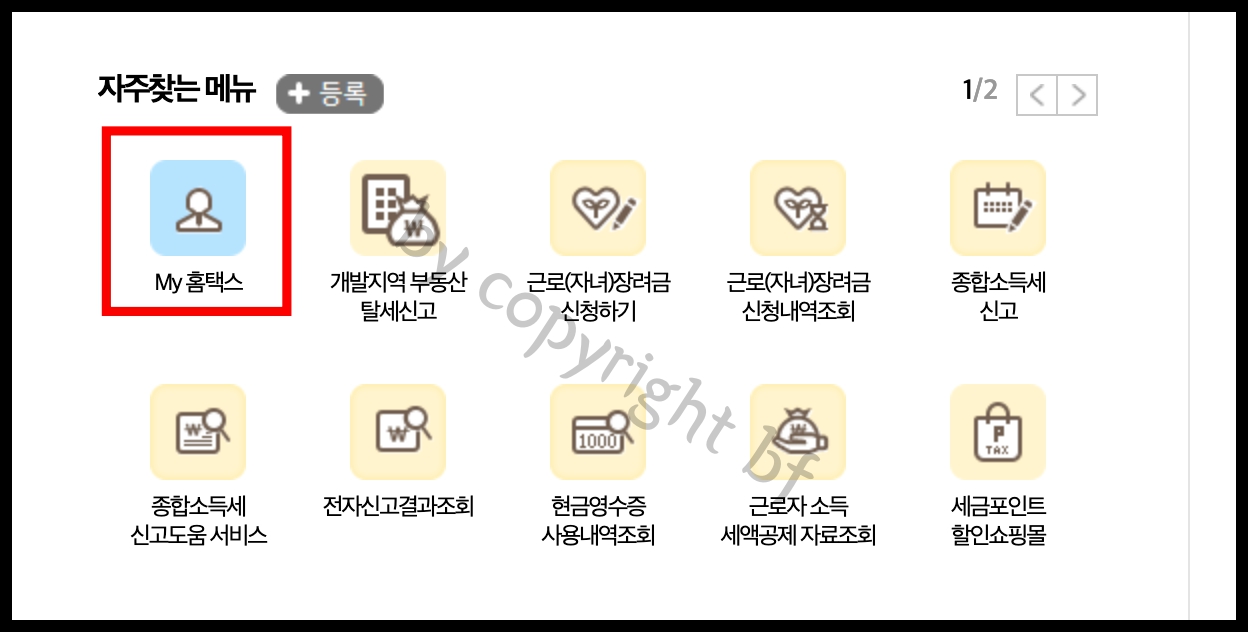 또한 메인 화면 가운데쯤 자주 찾는 메뉴가 있습니다. 거기에도 My 홈택스가 있습니다. 여기를 선택해주시면 됩니다.