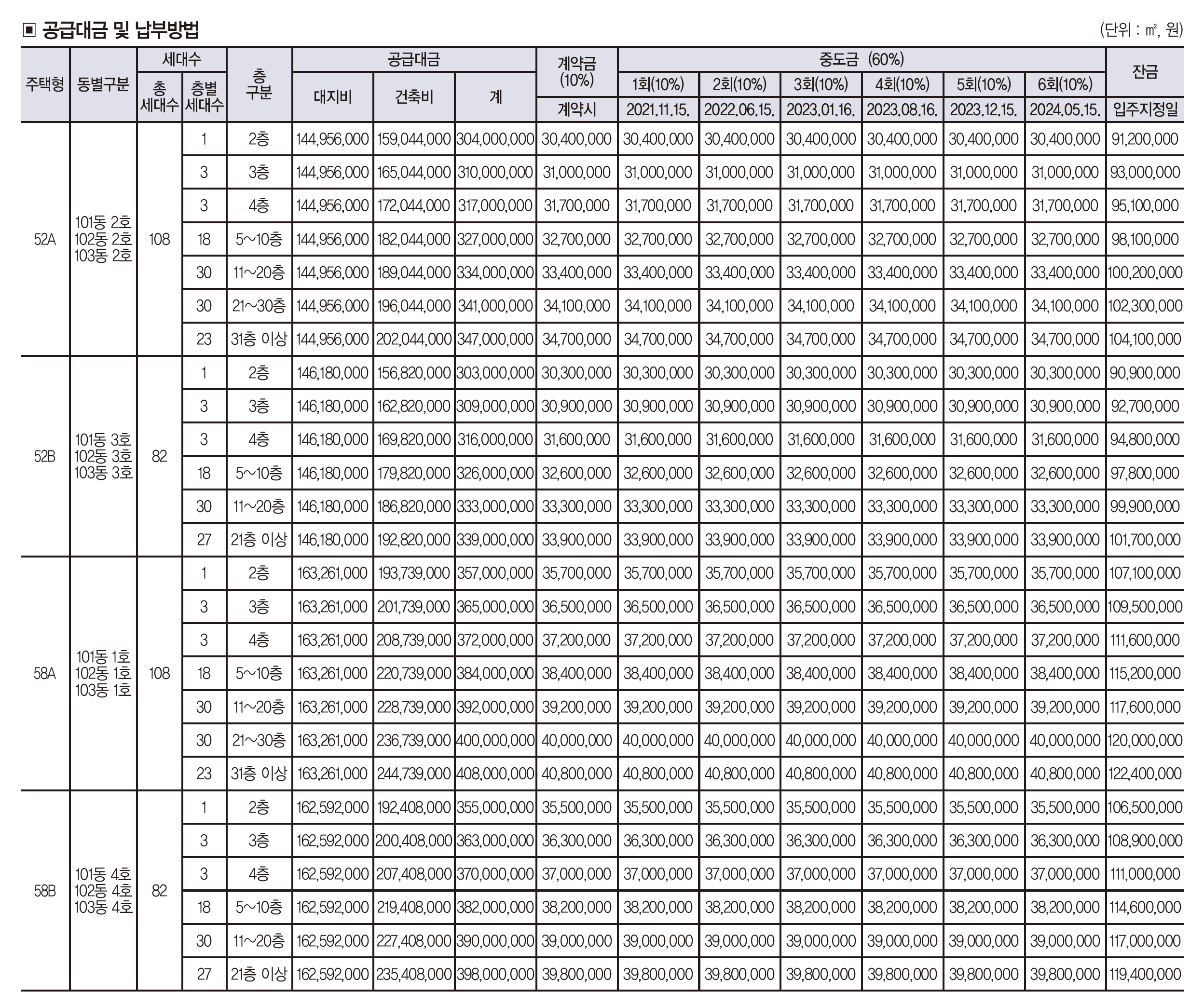58A와 58B의 기준층 분양가 : 11~20층 3억 9200만원, 3억 9000만원