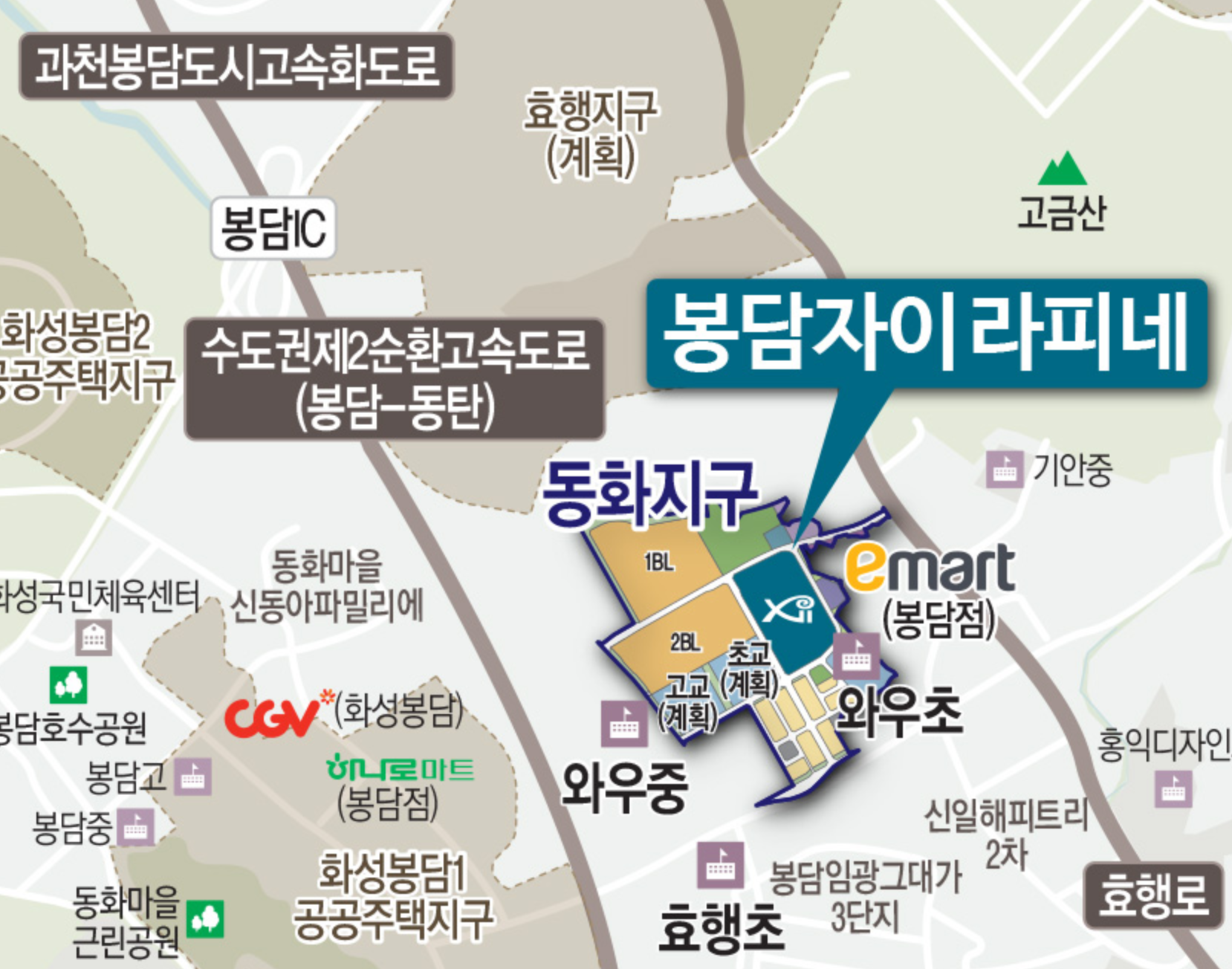 봉담 자이 라피네는 와우 초교, 와우중학교가 인근에 있고요. 이마트 봉담점도 가깝고 인근에 편의시설이 있습니다. 또한 수도권 제2 순환고속도로의 봉담 IC가 근처에 있어 도로교통도 좋아 보입니다.