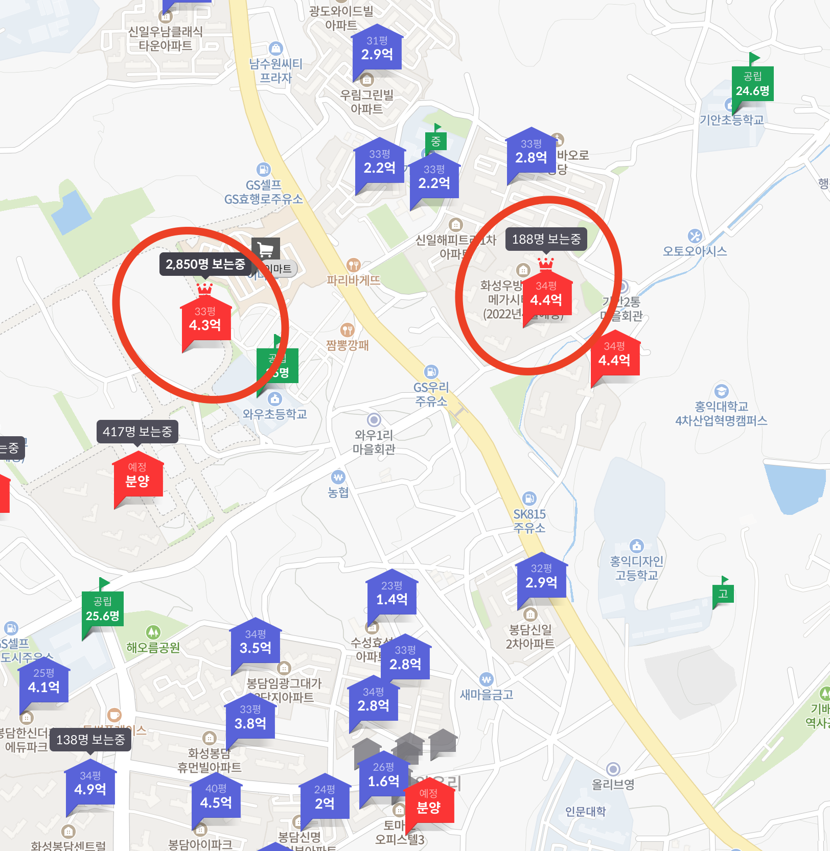 또한 인근 신축으로는 2019년 6월에 입주한 봉담 한신 더휴 에듀파크가 있는데요. 최근 실거래가는 5억 1500만 원이며 전세가는 3.4억 원입니다.