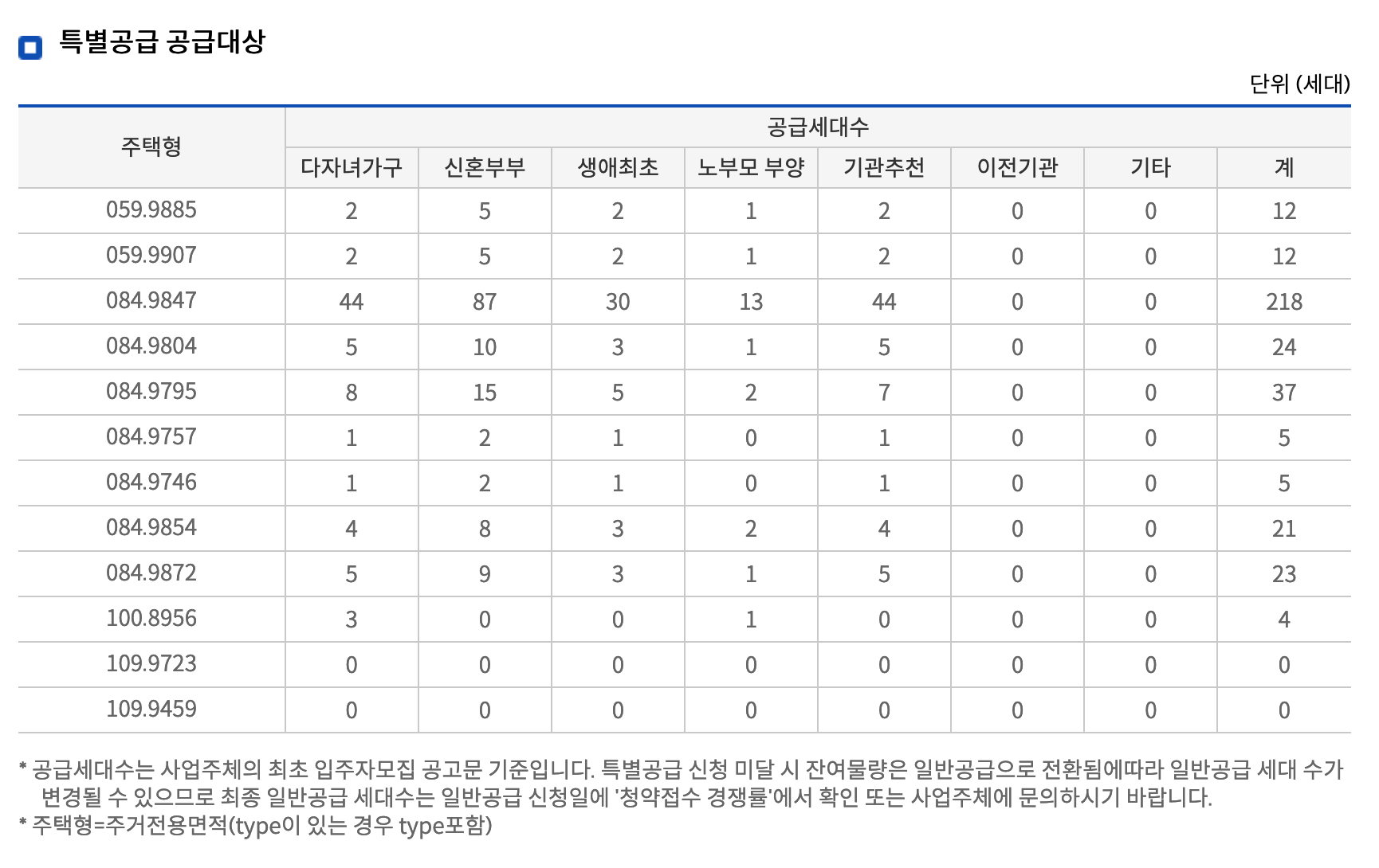 특히 84A이 물량이 가장 많습니다. 거의 특공 전체 물량의 절반 이상을 차지하는데요. 이점 참고하셔서 특공 청약을 하시기 바랍니다.