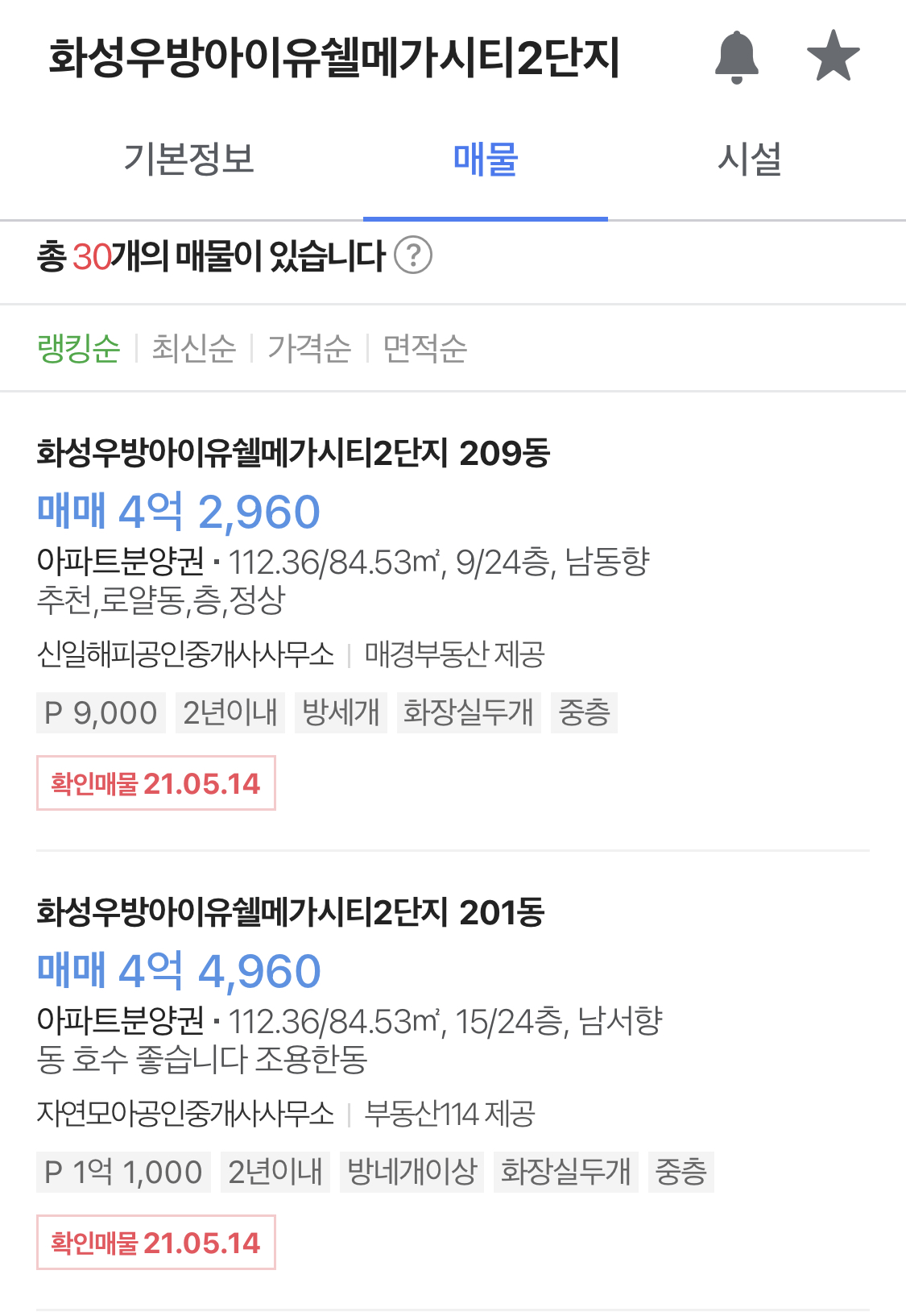 이번 분양하는 봉담 자이 라피네 부근에는 화성 우방 아이유셀 메가시티 2단지가 있는데요. 현재 우방 2단지의 시세는 아래와 같이 형성되어 있습니다.
